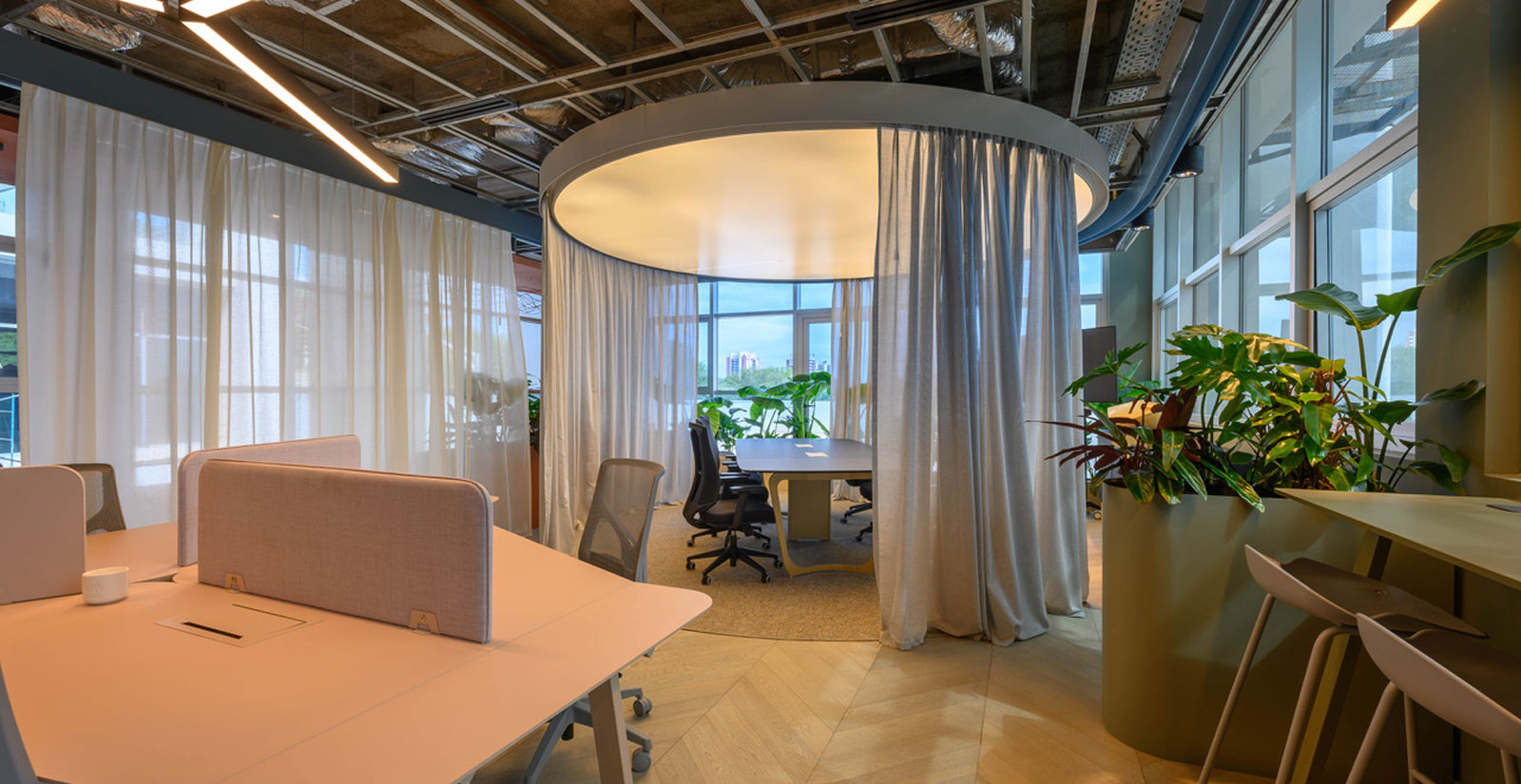 En el Espacio 26 – Coworking, Estudio Echaniz Gallo desarrolló su propuesta con la premisa de desarrollar un espacio de trabajo para ser vivido y disfrutado. Se materializaron dos sectores, una pastilla circular con un Cielorraso Tensado BARRISOL de acabado translúcido y otro sector con el mismo acabado combinado con el sistema de iluminación Light Lines.